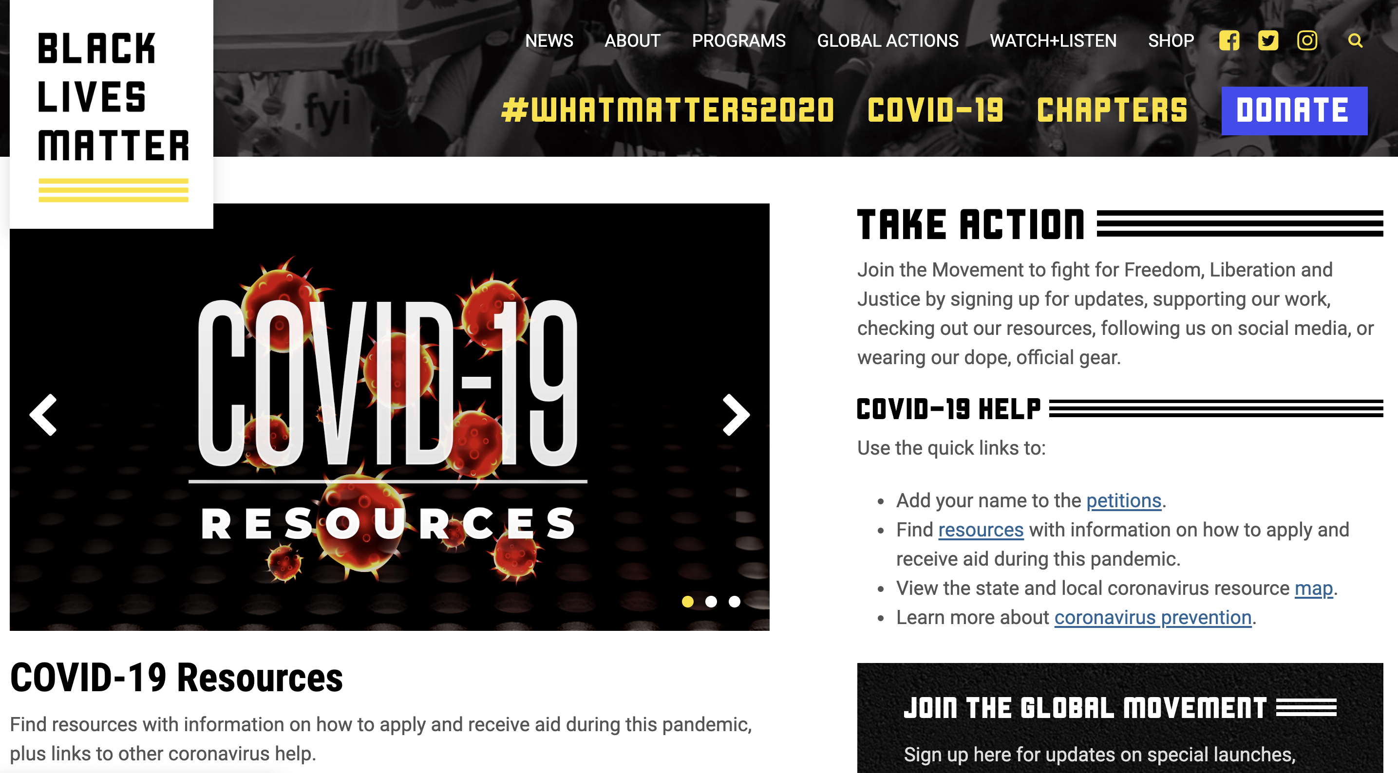 - Информируйте о том, что происходит: на сайте сделайте ситуативный баннер, информирующий аудиторию. Например, где купить продукты (партнерство с местным бизнесом), как вызвать врача, где найти волонтеров, информация о коронавирусе (ссылка на проверенный ресурс). Пример: информация на главной странице сайта Black lives matter.
