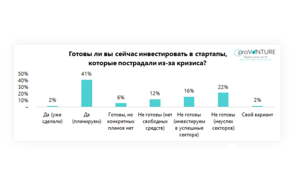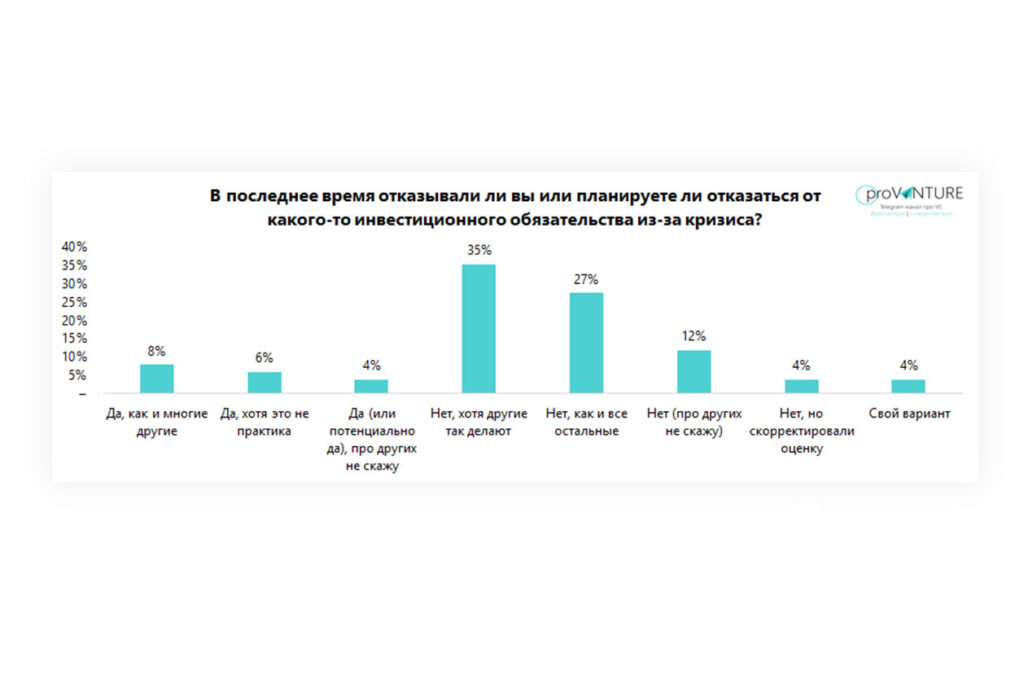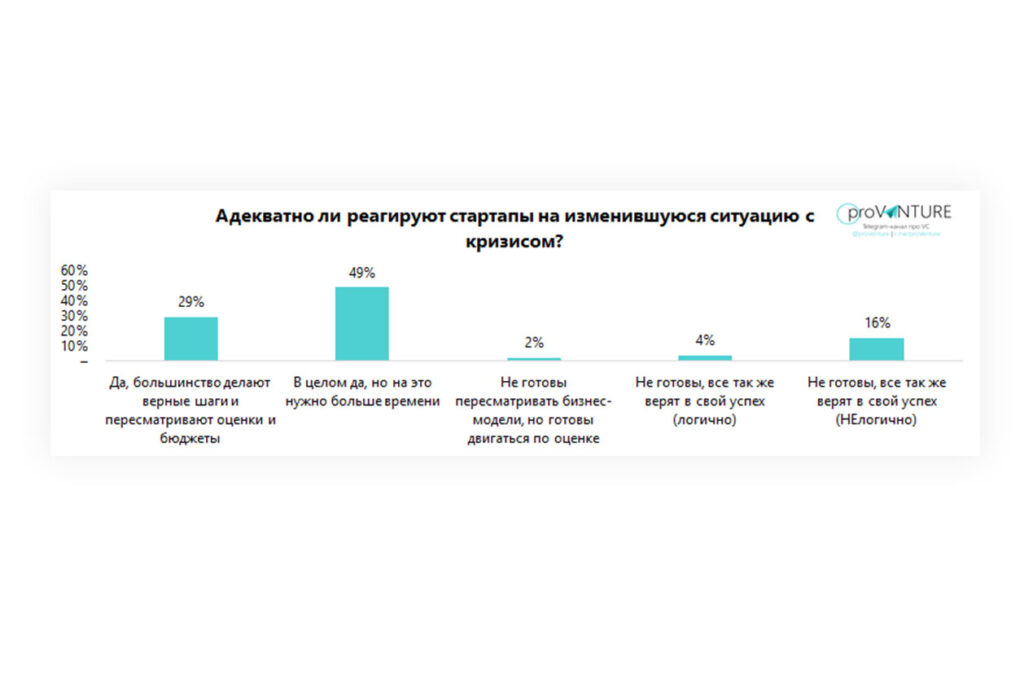 Также я спрашивал инвесторов о том, как себя ведут стартапы. 80% видят, что предприниматели реагируют на происходящее адекватно: готовы пересматривать условия сделок и прогнозы, адаптируют бизнес-модели к новым условиям.
