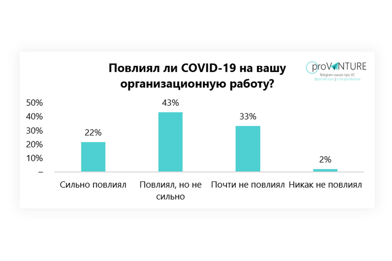 Только 3% российских инвесторов утверждают, что пандемия никак не сказалась на их работе. Среди оставшихся 97% более четверти (28%) говорят, что их работа изменилась сильно. В США ситуация отличается: только 83% участников опроса 500 Startups сказали, что коронавирус так или иначе повлиял на их работу. Остальные, видимо, работают, как раньше.