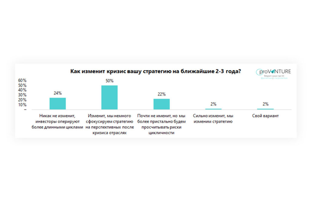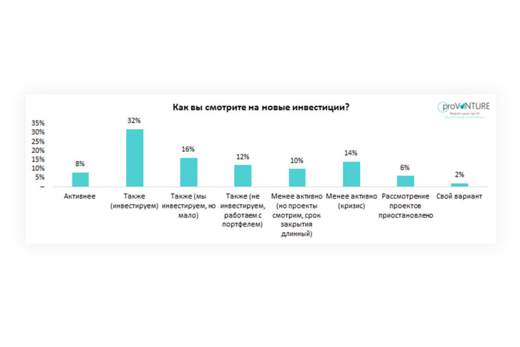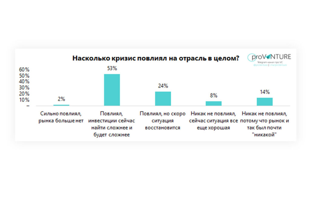 Большинство считают, что кризис повлиял на активность фондов, и инвестиции теперь найти сложнее — так считают 53% респондентов. С другой стороны, 22% сказали, что кризис не повлиял на рынок. 24% считают, что определенное влияние есть, но ситуация скоро нормализуется.