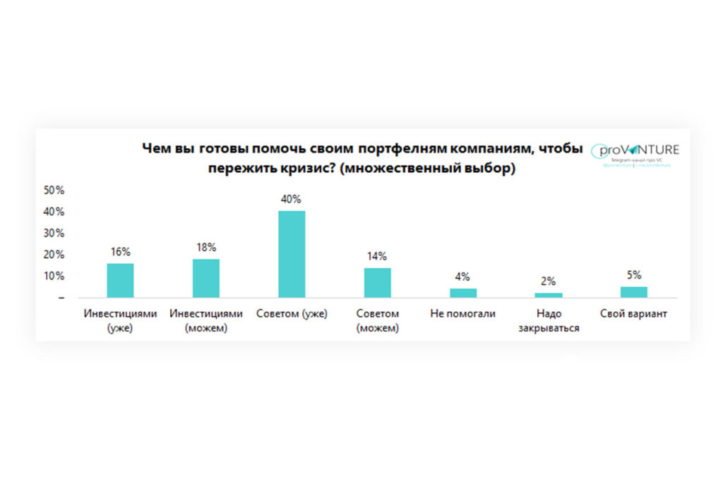 Мой опрос показывает, что фонды готовы помогать портфельным компаниям. 34% сообщили, что готовы помочь инвестициями (16% уже помогли), 54% сказали, что готовы помочь советом (и 40% уже работают с портфельными компаниями). Лишь 2% признались, что ничем не могут помочь. 4% сказали, что не будут этого делать принципиально.