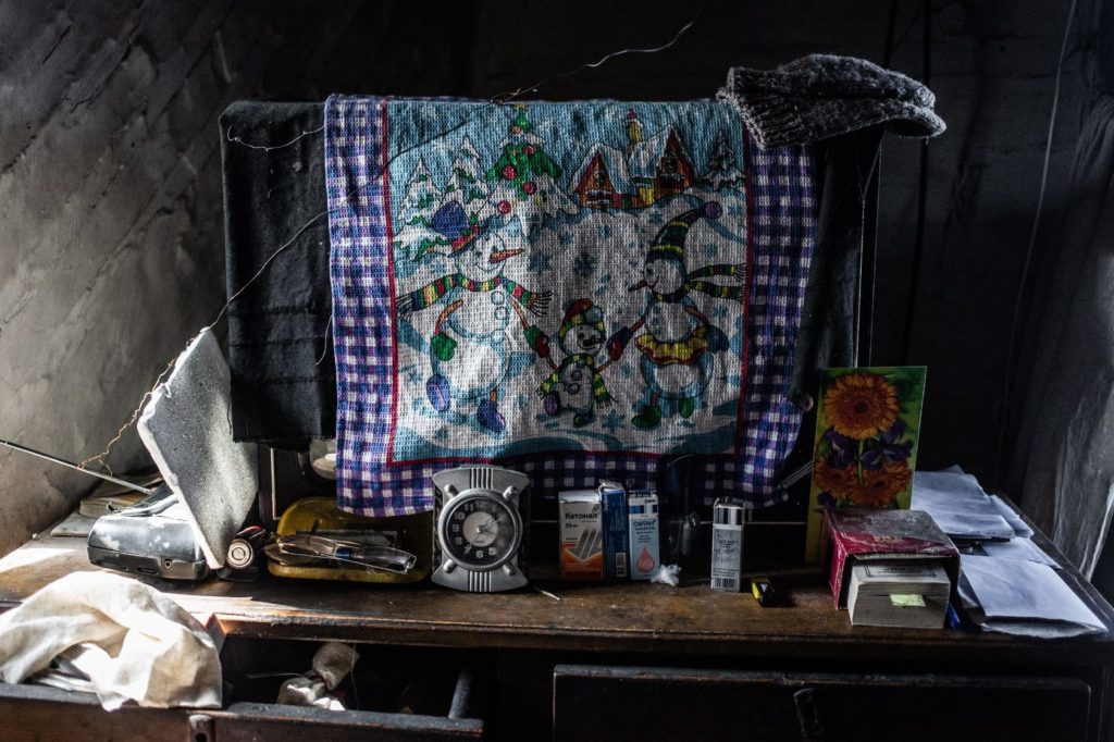 В комнате на комоде с выдвинутыми ящиками лежат вещи, которые хозяева дома решили оставить здесь. Чёрно-белая фотография молодой женщины с длинными волосами. С другой фотографии, тоже чёрно-белой, смотрит женщина постарше, она одета в тёмную кофту. Здесь же цветные фотографии — на площади стоит девочка в розовом спортивном костюме и белых кроссовках. На другой — парень вдвоём с мужчиной в форме.