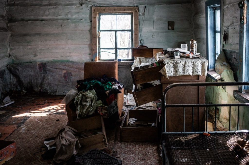 Хозяева не взяли в новую жизнь чью-то зачётную книжку спортсмена, удостоверение о сдаче технического экзамена. Аккуратно переступая между разбросанным по полу хламом и оглядываясь на свисающие куски клеёнки, мы бродим по дому, который хозяева оставили одним из последних в деревне. По вывернутым шкафам понятно, что по дому кто-то лазил и что-то искал.