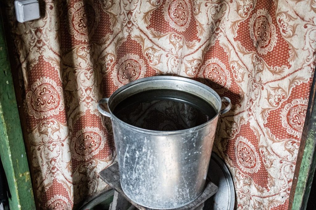 Зимой Нэля Николаевна топила снег, чтобы добыть воды. Сейчас собирает воду, которая стекает с крыши. Её пьёт и на ней готовит. «Молоко ещё пью. Утром пошла козу сцырканула (подоила — ЛБ), позавтракала, — рассказывает хозяйка. — Вы завтракать хочите? К обеду растопляю печку, чищу и жарю рыбу — минтай, селёдку. Пельмени могу сварить, только они растаяли, слиплись. Колбаса у меня есть». Холодильника в доме Поповой нет.
