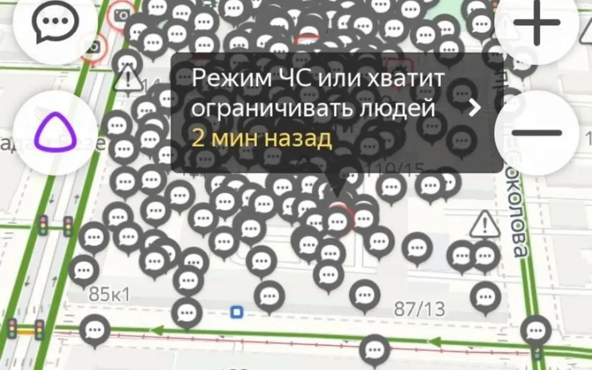 На карте «Яндекса» быстро появились комментарии: «Выплатите людям пособия!», «Покормите моих детей», «Хотим кушать! Работы нет!», «Или ЧС, или платите кредиты и коммуналку сами!». Пользователи оставляли их с помощью функции «Разговорчики» внутри приложения — обычно с ее помощью участники движения сообщают о ДТП или оставляют комментарий об объекте на карте.