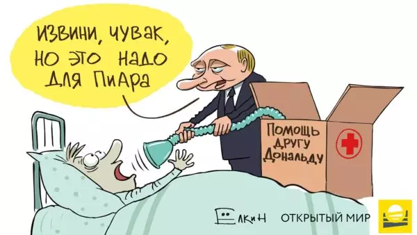 Речь идет о карикатуре Сергея Елкина для «Открытого мира» (проект «МБХ медиа»). На ней изображен Путин, который забирает аппарат ИВЛ у пациента в коробку с надписью «помощь другу Дональду».