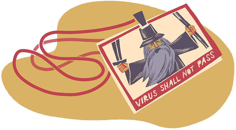 В начале апреля, во время видеоконференции президента с губернаторами, журналисты заметили, что пресс-секретарь Путина Дмитрий Песков носит на пиджаке какой-то зелёный бейджик. Позже оказалось, что это блокатор вируса — ходовой товар времён коронавируса.