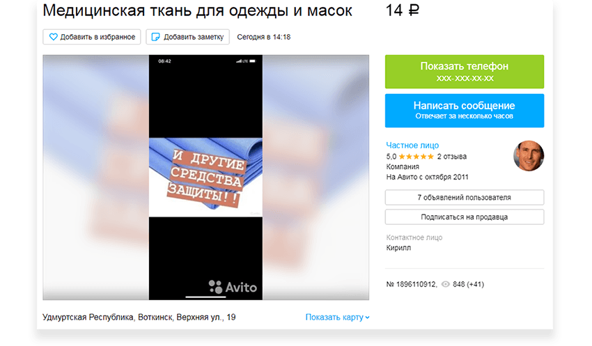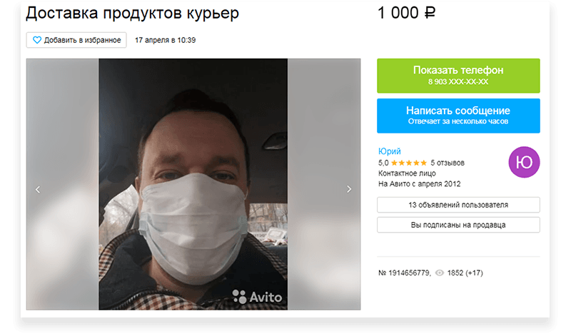 Следующая закупка прошла успешнее: хоть цена и была выше, к Кириллу приехал целый грузовик средств защиты. Тогда же молодой предприниматель выложил объявление на «Авито»: 24 рубля за обычную маску и 35 рублей за более продвинутую. Сперва Кирилл получал много откликов, но через два дня объявление удалили без объяснения причин. С середины марта «Авито», «Юла» и другие сервисы начали вести борьбу и блокировать предложения, связанные с коронавирусом. В пресс-службе «Авито» уточнили, что эта временная мера необходима, чтобы пресечь ценовую спекуляцию на товарах первой необходимости.