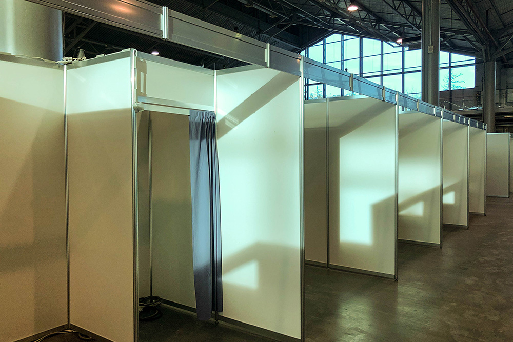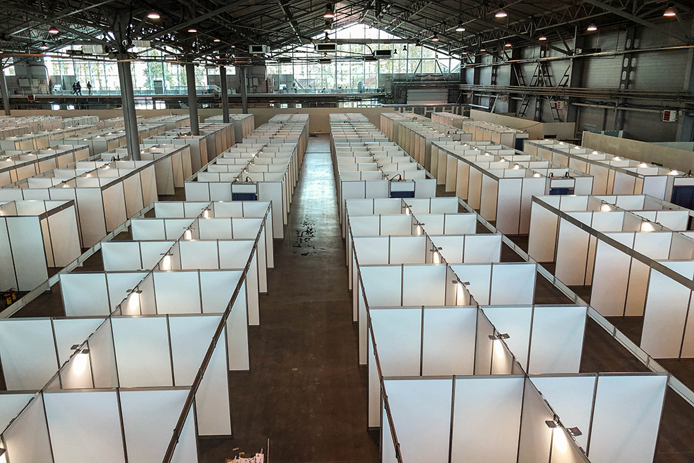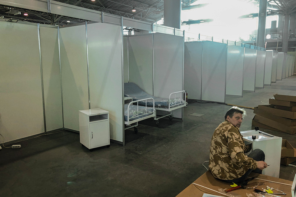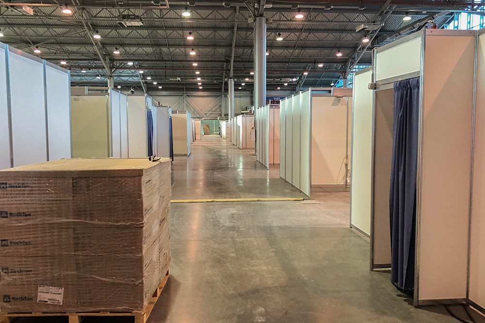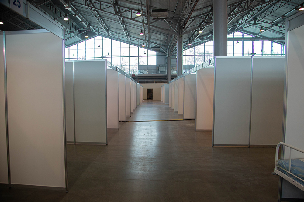 В седьмом павильоне выставочного комплекса «Ленэкспо» на Васильевском острове оборудуют госпиталь для пациентов с коронавирусом. Работы ведутся с 18 апреля, точные даты их окончания неизвестны. Предполагается, что там разместят до тысячи человек с легким течением инфекции, которые не могут лечиться дома. «Бумага» показывает, как выглядит госпиталь.