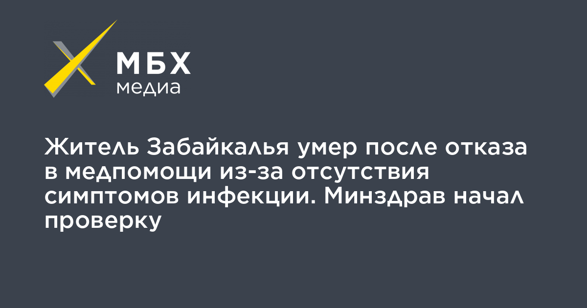 Минздрав Забайкальского края начал проверку из-за смерти 23 апреля 59-летнего жителя поселка Шерловая Борзинского района Валерия Кабакова, которому врачи отказали в медицинской помощи из-за отсутствия симптомов инфекционных заболеваний. Об этом «МБХ медиа» сообщила юрист «Зоны права» Анастасия Коптеева.