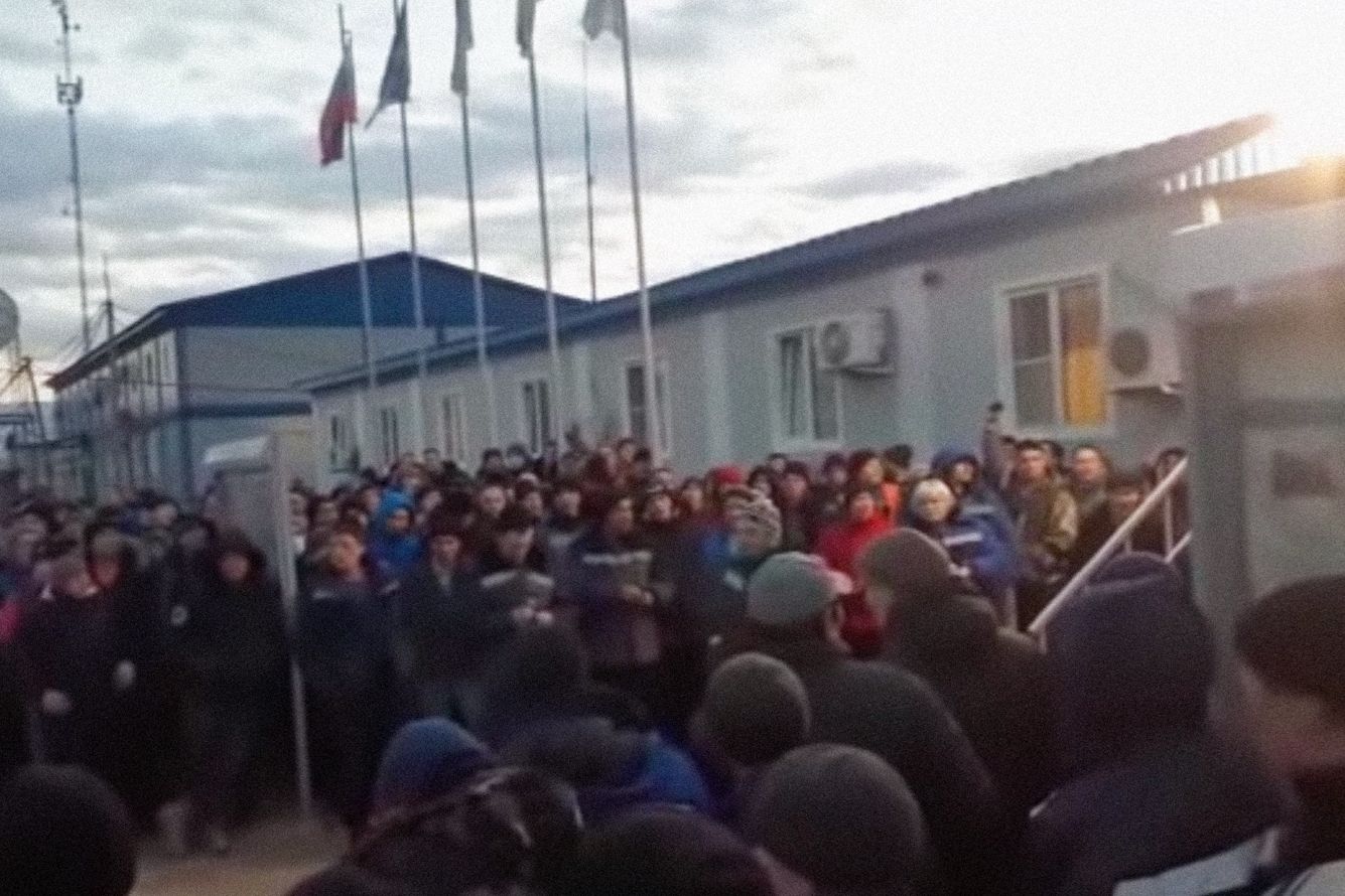 Hundreds of oil field workers in Yakutia gather together in a crowd to demand better protection against the coronavirus