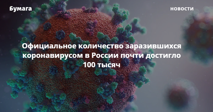 Всего в стране с начала эпидемии COVID-19 заболели 99 399 человек. За прошедший день выздоровели 1830 человек и умерли 108 человек. За весь период пандемии в России от коронавируса вылечились 10 286 человек, умерли 972.