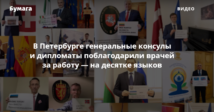 Генеральные консульства, работающие в Петербурге, записали совместное видео. В нем сотрудники благодарят врачей за работу, а также призывают горожан соблюдать режим самоизоляции, чтобы избежать угрозы распространения COVID-19.
