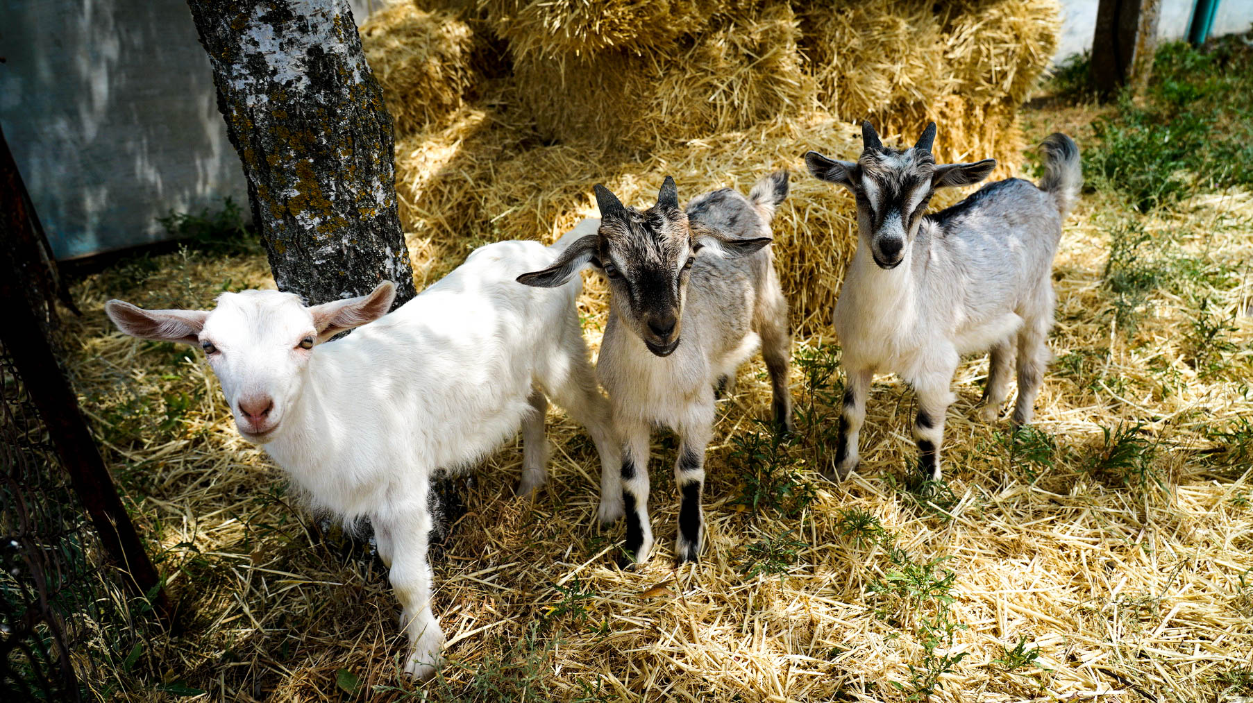 Животные родились еще в марте, но только в апреле они начали выходить на прогулки. Они играют друг с другом, пробуют сено и бодаются друг с другом.