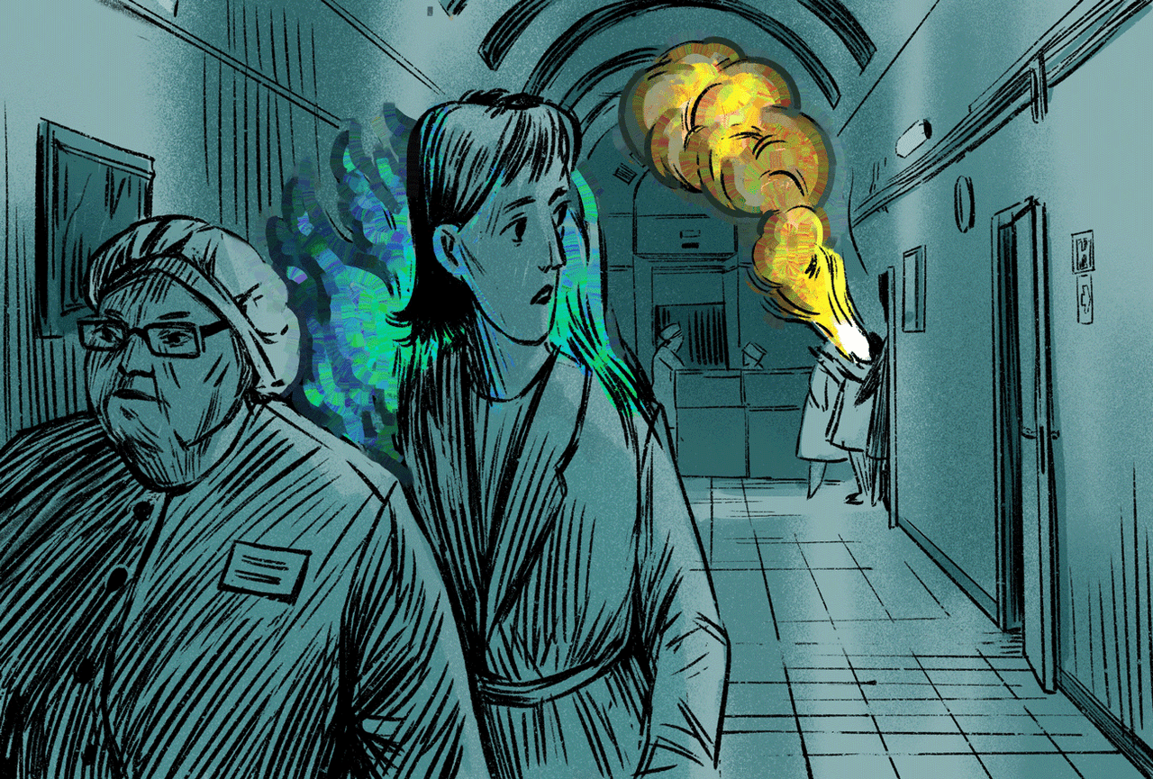 В воздухе пахнет унынием. Телевизор не работает, никто не понимает, почему посещения запретили и почему прогулок больше не будет. В какой-то момент санитарка произносит слово «карантин» — и становится ясно, что происходящее связано с коронавирусом. Но что происходит на самом деле, какая статистика и что за окном, никто не знает.