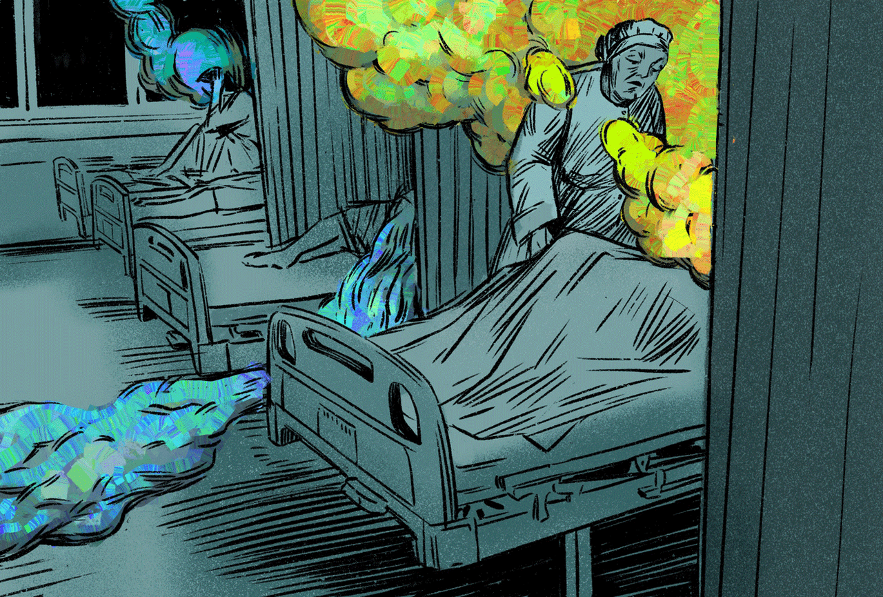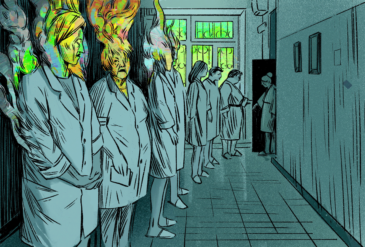 «Мы больше не справляемся», — говорит мне Настя, глядя вокруг. У Насти огромные синяки под глазами, она постоянно зевает и иногда плачет. В коридоре слышится очередной вопль санитарки, мы вздрагиваем. «У неё температура! Она кашляет! Тридцать семь и пять! Нас всех сейчас здесь закроют!» Это кашляет новая поступившая.