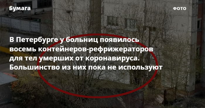 «Фонтанка» пишет, что контейнеры-рефрижераторы появились в том числе у морга городской больницы № 2 в Учебном переулке и у Госпиталя для ветеранов войн на Народной улице. Подробнее о ситуациях в больницах города и нагрузках на персонал «Бумага» писала здесь.
