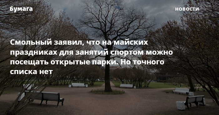 «Если возникла необходимость выполнить ряд физических упражнений на открытом воздухе, следует выбирать открытые для посещений парки и скверы и время, чтобы обеспечить дистанцию с людьми более 5 [метров]», — пишет Смольный. При этом, как выбрать незапрещенные для посещения парки, не объясняется.
