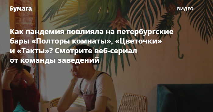 Команда петербургских баров «Полторы комнаты», «Цветочки» и «Такты» снимает документальный сериал о влиянии эпидемии коронавируса на их заведения и сотрудников. Там показывают, как работники баров начали работать на доставку, что думают о происходящем с их индустрией и как учатся выживать в новых условиях.