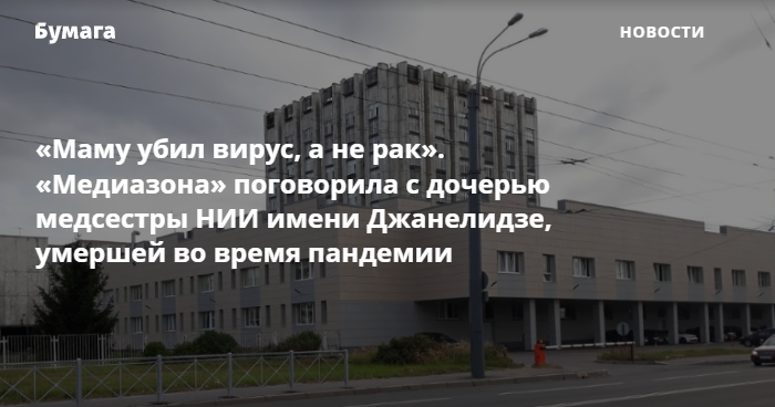 Издание «Медиазона» опубликовало монолог Анны Шужиной — дочери медицинской сестры НИИ скорой помощи имени Джанелидзе Валентины Шужиной. Медик скончалась во время пандемии, но пока не попала в официальную статистику смертей от COVID-19.