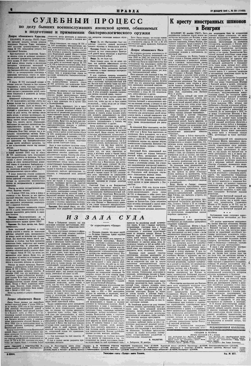 А 22 ноября 1949 года на стол Сталина лег документ за подписями министра внутренних дел Круглова, генерального прокурора Григория Сафонова и министра юстиции Константина Горшенина «Об окончании следствия по делу японских генералов и офицеров, служивших в противоэпидемическом отряде № 731». На деле, до завершения оказалось далеко, следствие, по сути, только развернулось: наиболее интенсивным «допросным днем» значится 6 декабря 1949 года — той датой помечено аж одиннадцать допросов-показаний! По сути, все лепилось на коленке именно тогда: 9 декабря Сталину, наконец, представили проект обвинительного заключения и приговора, в то время как последний допрос провели днем позже — 10 декабря.
