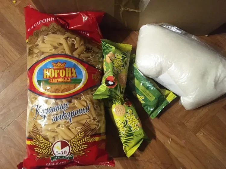 В Николаевске Волгоградской области в набор включили четыре яйца и четыре сосиски, молоко, десяток булочек и печенье россыпью. А в деревне Лозное Дубовского района — крупу, макароны и гнилые овощи.