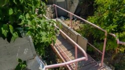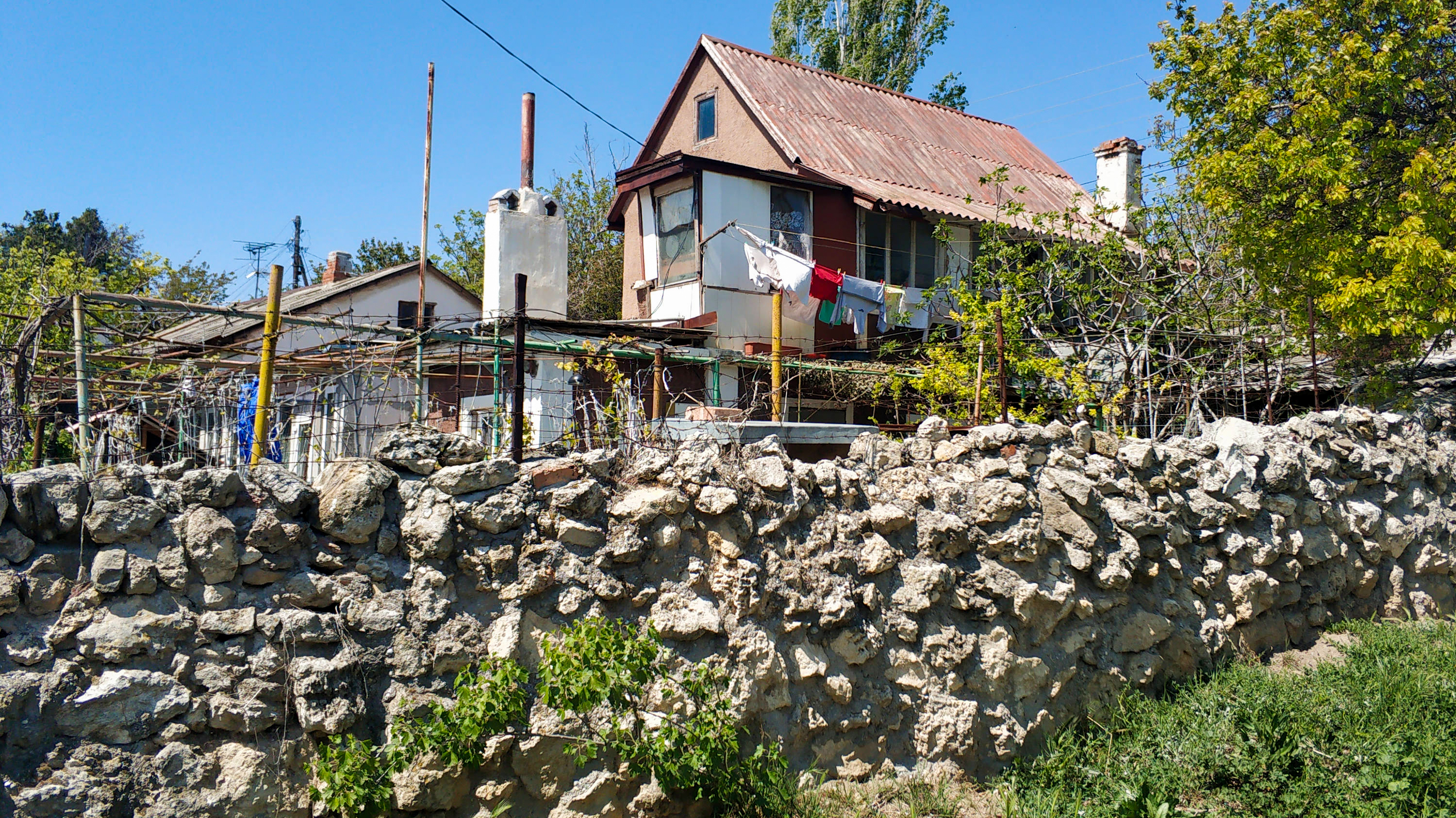 Розовой краской покрашен мостик через водосток и похожим цветом на стенах и ступенях нанесены призывы сидеть дома. Реалии нынешнего режима «самоизоляции» докатились и сюда. На улицах за время всего «похода» мне встретились всего пару человек, но во дворах частных домов вовсю кипела работа: вскапывались грядки, красились заборы и штукатурились стены.