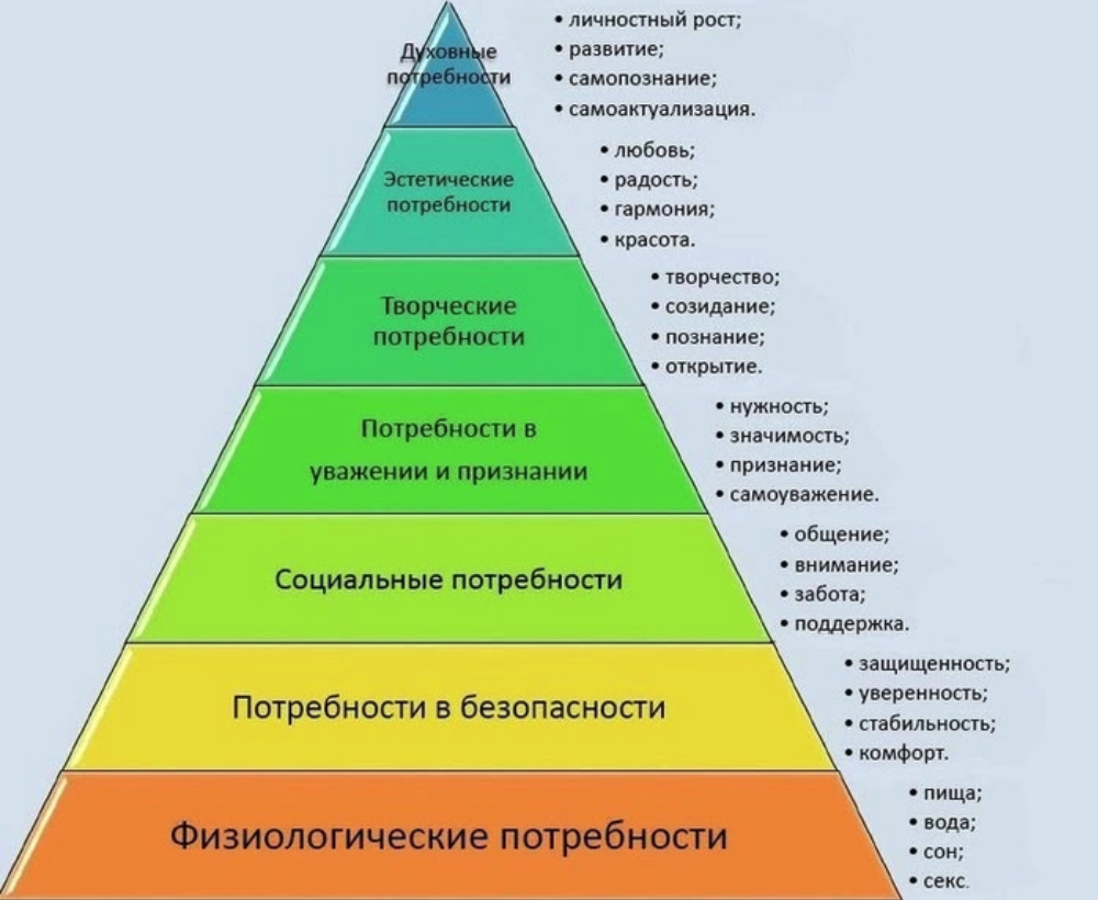 А ещё теории постоянно подвергаются пересмотру. Мой любимый пример тут — «пирамида Маслоу» из учебника по обществознанию. Коротко напомню, в чём дело: в середине прошлого века американский психолог Абрахам Маслоу предложил иерархию потребностей человека, вот такую: