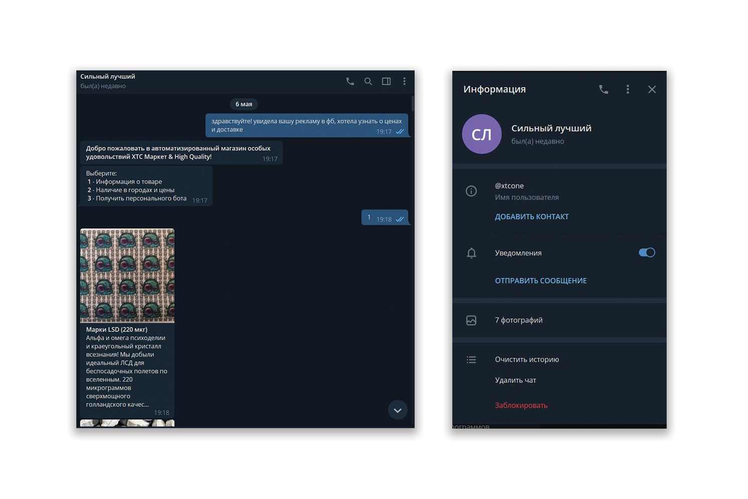 Другие соцсети, в том числе российские, тоже часто пропускают рекламные объявления о продаже наркотиков — причем иногда и более откровенные. В 2018 году начальник Главного управления по контролю за оборотом наркотиков МВД Андрей Храпов называл «абсолютным лидером среди соцсетей в России по использованию в качестве ресурса для рекламы и распространения наркотиков» соцсеть «ВКонтакте». По его словам, на «ВКонтакте» пришлось 89% запросов Роскомнадзора о наркотиках по соцсетям, 8% — на «Одноклассники», остальное — на Facebook и «Живой журнал». The Bell и сейчас нашел во «ВКонтакте» рекламу XTC Market, где прямо указано, что магазин торгует «препаратами для познания истины».