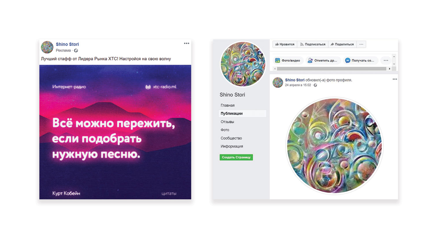В конце апреля Facebook начал показывать рекламу якобы онлайн-радиостанции, размещенную аккаунтом Shino Stori, со следующим текстом: «Лучший стафф от Лидера Рынка XTC! Настройся на свою волну». Ссылка в объявлении вела на сайт, очень поверхностно замаскированный под радиостанцию с пятью плейлистами под названиями известных наркотиков. Сразу под ними располагается большой баннер, ведущий в магазин наркотиков XTC Market на площадке Hydra в даркнете, а также его телеграм-аккаунт.
