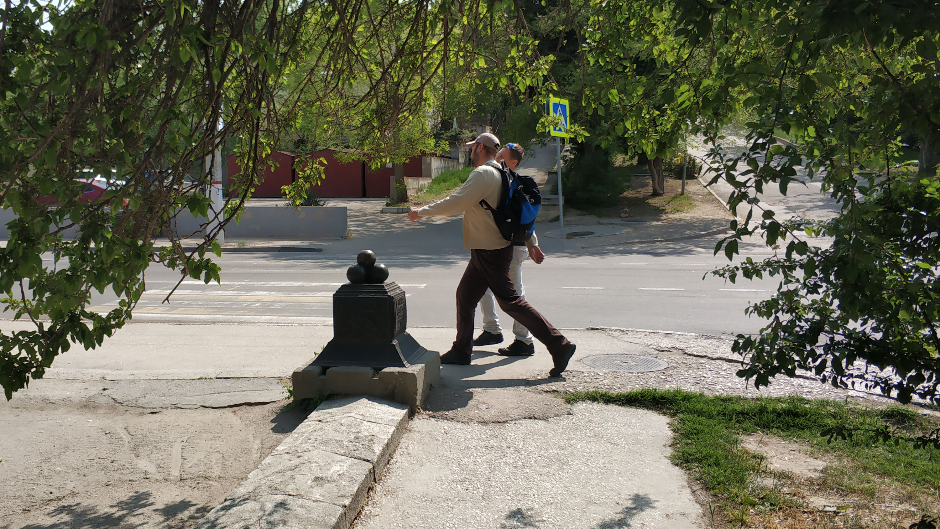 В сквере буйно цветут иудины деревья, резвятся дошколята, за которыми наблюдают их мамы. Режим самоизоляции, в общем, никто не соблюдает. Особенно, учитывая, что сквер по российскому законодательству является «общественным пространством». Бутылка из-под шампанского подсказывает, что и по вечерам тут запреты особо не блюдут, а перед военными памятниками не благоговеют.