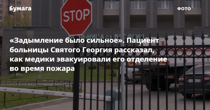 Пациент больницы Святого Георгия Сергей Никифоров рассказал, как его отделение эвакуировали после начала пожара утром 12 мая. Аудиозапись его рассказа предоставила «Бумаге» пресс-служба губернатора Петербурга.