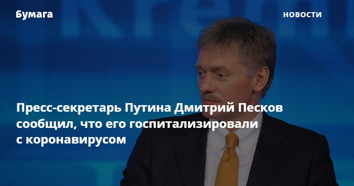 Пресс-секретарь президента России Владимира Путина Дмитрий Песков госпитализирован с коронавирусом. Об этом пишут «РИА Новости» со ссылкой на заявление Пескова.