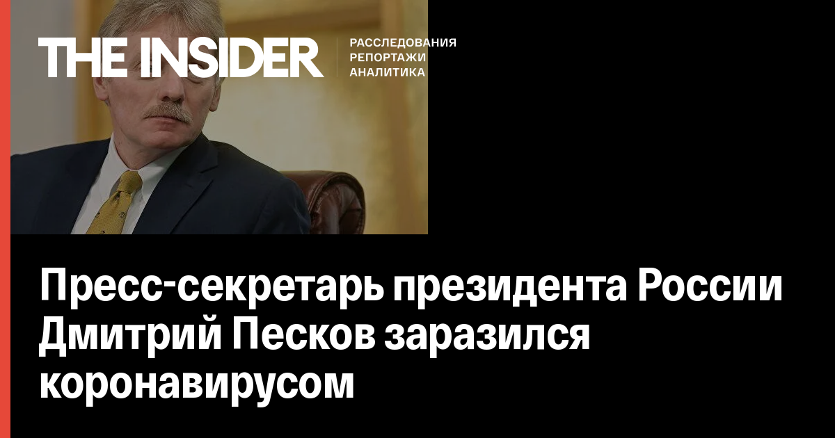 Пресс-секретарь президента России Дмитрий Песков подтвердил «Интерфаксу», что заразился коронавирусом. «Заболел, лечусь», — заявил он, добавив, что находится в больнице. Песков также отметил, что очно контактировал с Владимиром Путиным больше месяца назад.