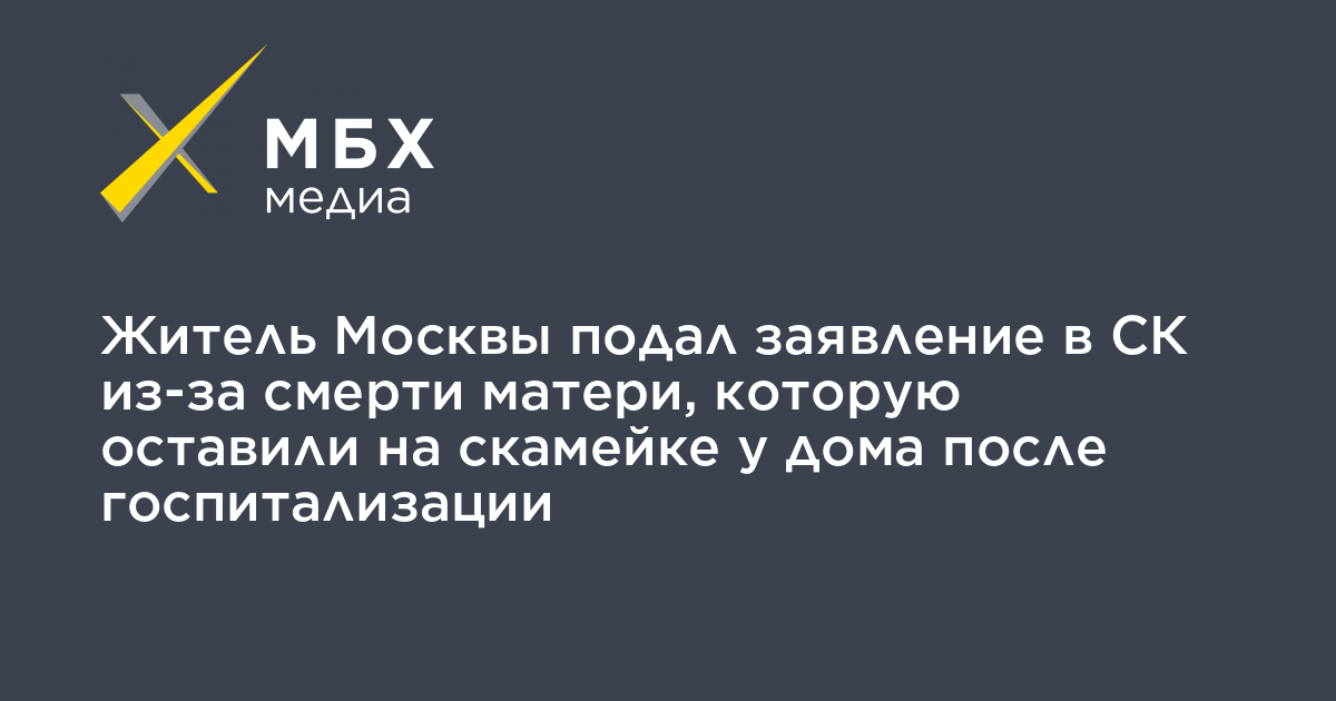 Житель Москвы Кирилл Чуклов написал заявление в столичный СК из-за смерти матери Елены Чукловой, которую оставили на скамейке у дома после госпитализации. Об этом сообщил «МБХ медиа» координатор «Правозащиты Открытки» Алексей Прянишников, подготовивший заявление.