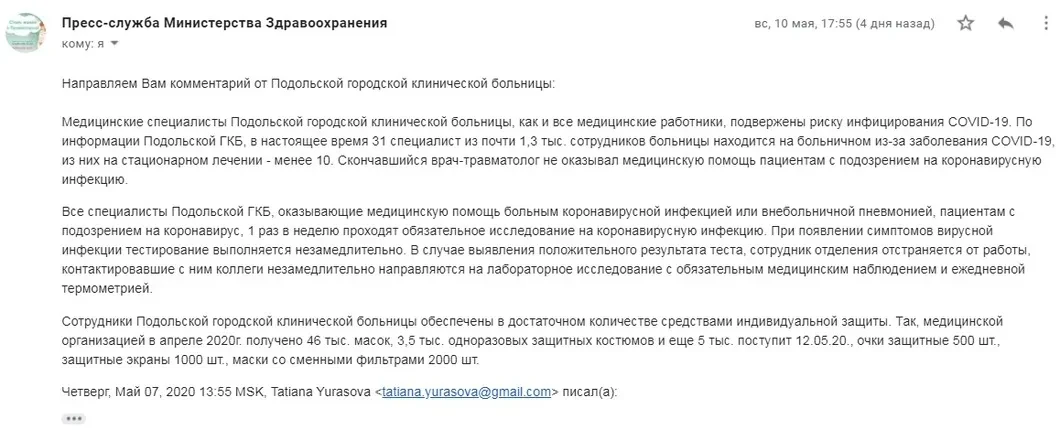 Ситуация выглядела тревожной, поэтому мы подготовили запросы на бланке редакции и с печатью и 7 мая направили их в два адреса: главному врачу Подольской ГКБ Вардану Геворкяну и министру здравоохранения Московской области Светлане Стригунковой. В запросах мы просили подтвердить или опровергнуть ситуацию с заболеваемостью медперсонала в Подольской горбольнице, а также сообщить, почему людей не тестируют на COVID и выделяют недостаточно СИЗ.