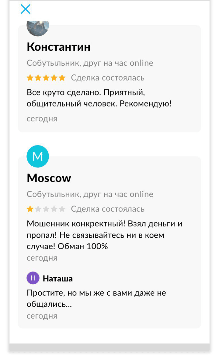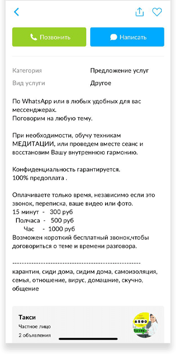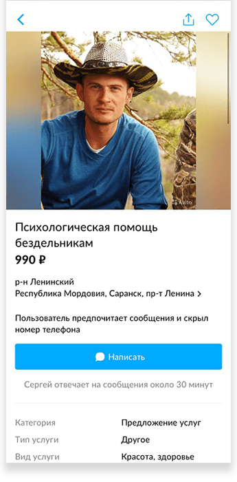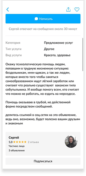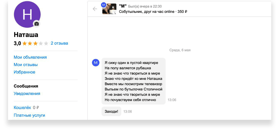 «Вы с этой самоизоляцией с ума посходили! Откуда столько предложений такого характера? Неужели больше никак не заработать? И вы готовы себя продавать?» — написал мне один из пользователей. Когда количество похожих возмущённых комментариев к моей анкете перевалило за дюжину, я стала анализировать профили авито-хейтеров. Мне хотелось понять, кто все эти высокоморальные люди. У одного висели объявления о продаже участка в шесть соток и надувного матраса, другой предлагал шашлык на развес и бампер для «мазды», третьему кто-то оставил хороший отзыв к услуге «мелкий бытовой ремонт». Всерьёз сердиться на них не получалось: все мы в одной авито-лодке, и цель у нас одна — заработок. Ещё меня поражала открытость и непосредственность людей, которые писали в личку. Вообще «Авито» напоминает интернет начала нулевых, когда ни чувства стыда, ни онлайн-этикета, ни новой, основанной на инклюзивности, этики ещё не существовало и можно было лезть со своим мнением куда угодно и получать от этого кайф.