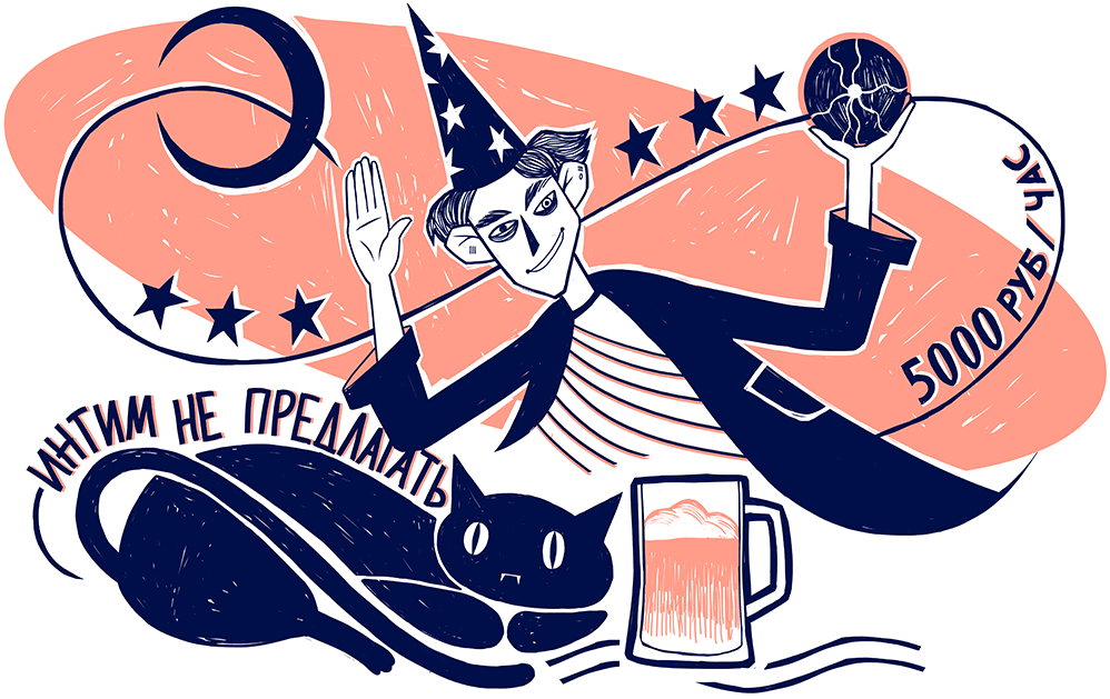 «Собутыльник с обучением казачьему пению, 350 ₽/час. Опохмел по зуму бесплатно», — предлагает мужчина из Крыма. «Профессиональный сомелье организует урок в приятной компании; научу выбирать вино, стоимость 1500 рублей», — анкета из Новосибирска. «18 человек, сидим дома и бухаем в Zoom. Наши фунфурье будут с вами на связи 24/7 за 500 рублей», — пишет весёлая компания из Москвы. Также за 500 рублей можно выпить с котом из Саратова: «Интим не предлагать! Услуги: фотосессии, напугать родственников/знакомых/неприятелей. Отличный собутыльник». Но больше всего меня заинтриговал маг и хиромант, владеющий «собственным эротическим театром». Если бы час его работы стоил меньше 5000 рублей, я бы, возможно, соблазнилась.