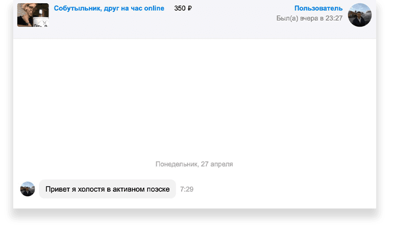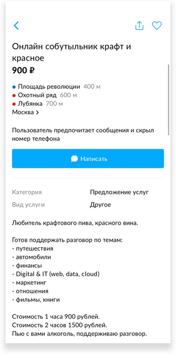 Из журналистского любопытства и с надеждой немного заработать я создала свою анкету. Я только начинала собутыльнический путь, поэтому выставила скромную таксу в 350 рублей в час — хотя, как я поняла, обычно москвичи берут не меньше 500, а за 350 можно позволить себе, например, нижегородца. Кажется, «Авито» — это Россия в миниатюре; по крайней мере, необъяснимый разрыв в уровне доходов между регионами и столицей тут сохраняется.