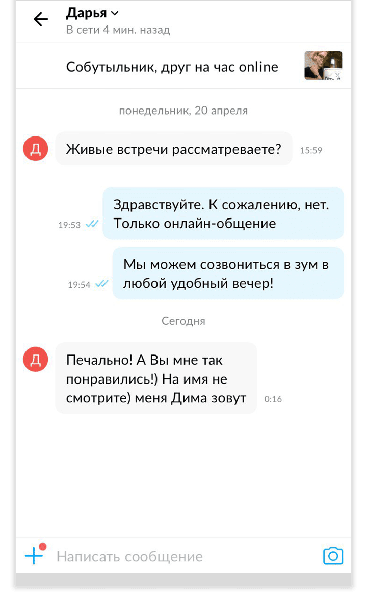 После публикации объявления на меня обрушилась вся мощь интернет-комментаторов: «Это что, новый вид проституции?»; «И не стыдно такое вывешивать?»; «Малышка, предлагаю интим встречи на твоих условиях». Я добавила строчку «не знакомлюсь», но это не особо помогло — поток шейминга и предложений интима не останавливался. Но как только я задумалась о том, чтобы удалить анкету, мне написал некий Антон: «Не желаете ли пообщаться с вашим соотечественником, застрявшим волею судьбы в лагере для беженцев в Нидерландах?»