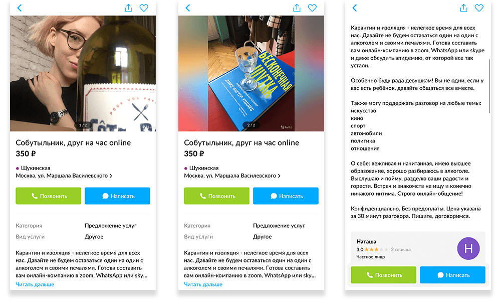 После начала карантина на «Авито» появились сотни объявлений об онлайн-собутыльничестве. Разброс цен — от 50 до 5000 рублей в час. В профилях люди фотографируются в тканевых масках с бокалами, подробно рассказывают о предпочтениях в алкоголе, хвастаются знанием языков и не стесняются жаловаться на безработицу. Связь предлагают через Zoom, Skype, WhatsApp и Viber, оплата — на «Сбер», «Тинькофф» или QIWI-кошелёк. Есть и те, кто созванивается бесплатно: «Брать за общение деньги — это низко, поэтому давайте просто выпьем и поддержим друг друга на карантине», — пишет в анкете Алексей из Долгопрудного. Позже я поняла, что так считает не он один.
