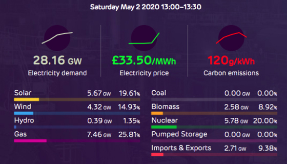 DRAX Electric Insights Рисунок 1. Структура производства электроэнергии в Великобритании 2 мая 2020 года с 13:00 до 13:30 (по источникам энергии)