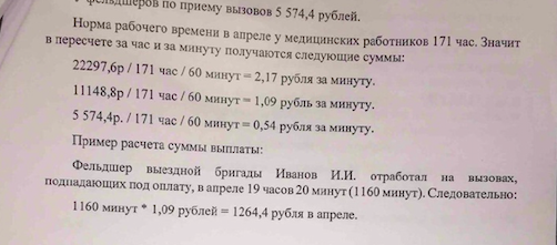 «Фельдшер выездной бригады Иванов. И. И. отработал на вызовах, подпадающих под оплату в апреле, 19 часов 20 минут (1 160 минут). Следовательно: 1 160 минут * 1,09 = 1 264,4 рубля в апреле», — приводится пример расчета.