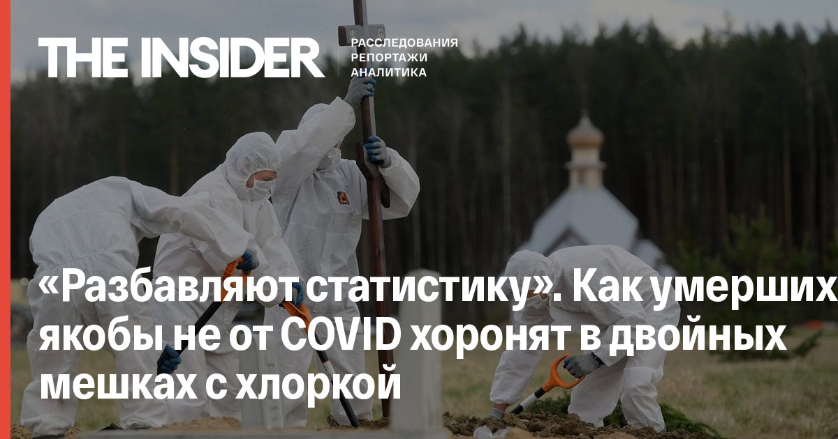 Как минимум половина покойных попадает в ритуальные агентства из инфекционных больниц без диагноза «новая коронавирусная инфекция», рассказали The Insider глава ритуальной фирмы «Честный агент» Павел Сосновый и гендиректор компании «Похоронные дома Журавли» Илья Болтунов. Но тела этих умерших якобы от обычной пневмонии и острых респираторных заболеваний в ритуальные агентства из больниц доставляют со всеми мерами предосторожности, характерными для защиты от COVID — кладут в двойные мешки и засыпают хлором внутри и снаружи.