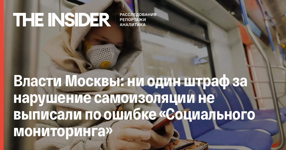 Руководитель московского департамента информационных технологий Эдуард Лысенко заявил, что ни один штраф за нарушение самоизоляции не был выписан из-за ошибки приложения «Социальный мониторинг». Однако часть из них аннулируют.