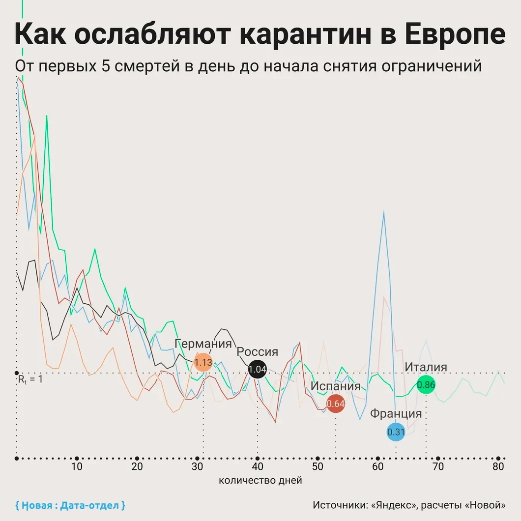 Другие страны, как правило, начинают снимать ограничения, если прирост заболеваемости остается низким в течение одной-двух недель. Например, в Испании карантин начали смягчать после того, как коэффициент распространения вируса оставался ниже единицы в течение пяти дней. В Италии Rt держался ниже порогового значения почти две недели, прежде чем власти ослабили режим изоляции.