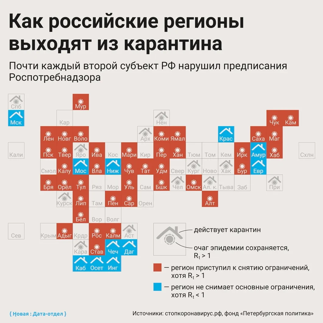 По расчетам «Новой», две трети регионов начали снимать ограничение в нарушение рекомендаций Роспотребнадзора,