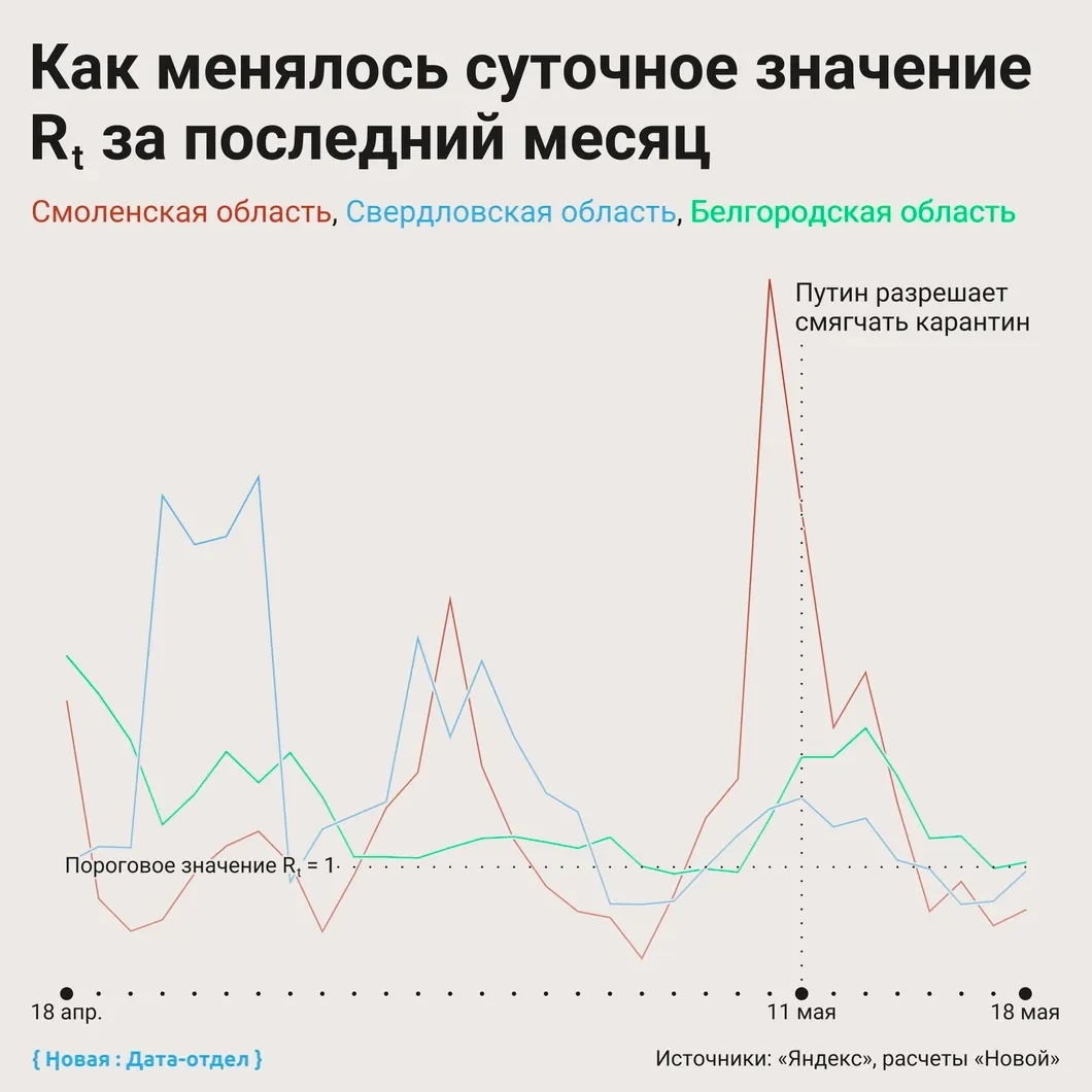 За несколько дней до выступления президента Роспотребнадзор опубликовал методические рекомендации для поэтапного снятия ограничений. Один из основных критериев — коэффициент воспроизводства вируса Rt, который показывает,