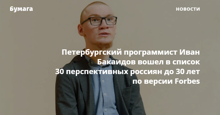 В 2016 году «Бумага» писала, как Бакаидов, еще будучи девятиклассником, разрабатывал сайты и алгоритмы, помогающие общаться людям с речевыми нарушениями. Читайте также текст о том, как Бакаидов добивался выдачи банковской карты и получил отказы в пяти банках, так как не мог оставить подпись из-за ДЦП.