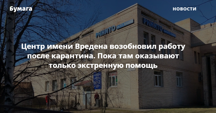 НИИ травматологии и ортопедии имени Вредена открылся после коронавирусного карантина. Сейчас учреждение оказывает только экстренную помощь, пишет ТАСС со ссылкой на директора института Рашида Тихилова.
